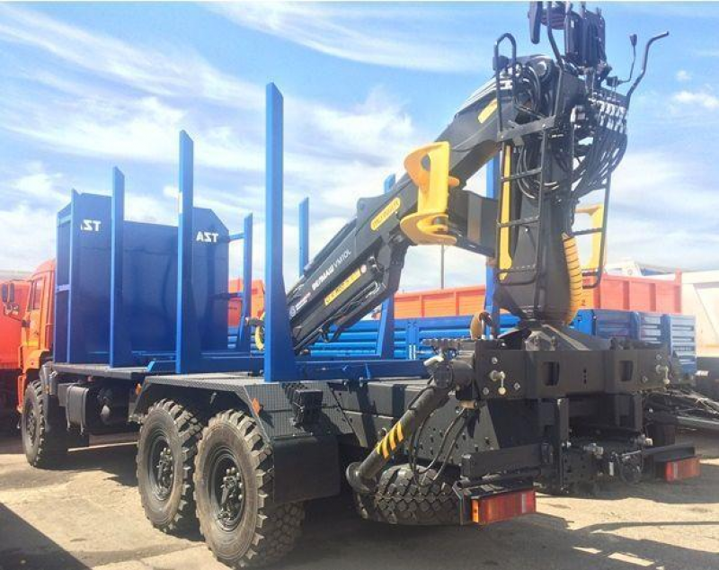 Автомобиль-сортиментовоз с ГМУ состоит из следующих основных сборочных единиц: шасси автомобиля KAMA3-43118 и навесного технологического оборудования, включающего в себя надрамник, ограждение кабины, коники, кожухи грязезащитные, лестницу, электрооборудование, гидроманипулятор и гидрооборудование.